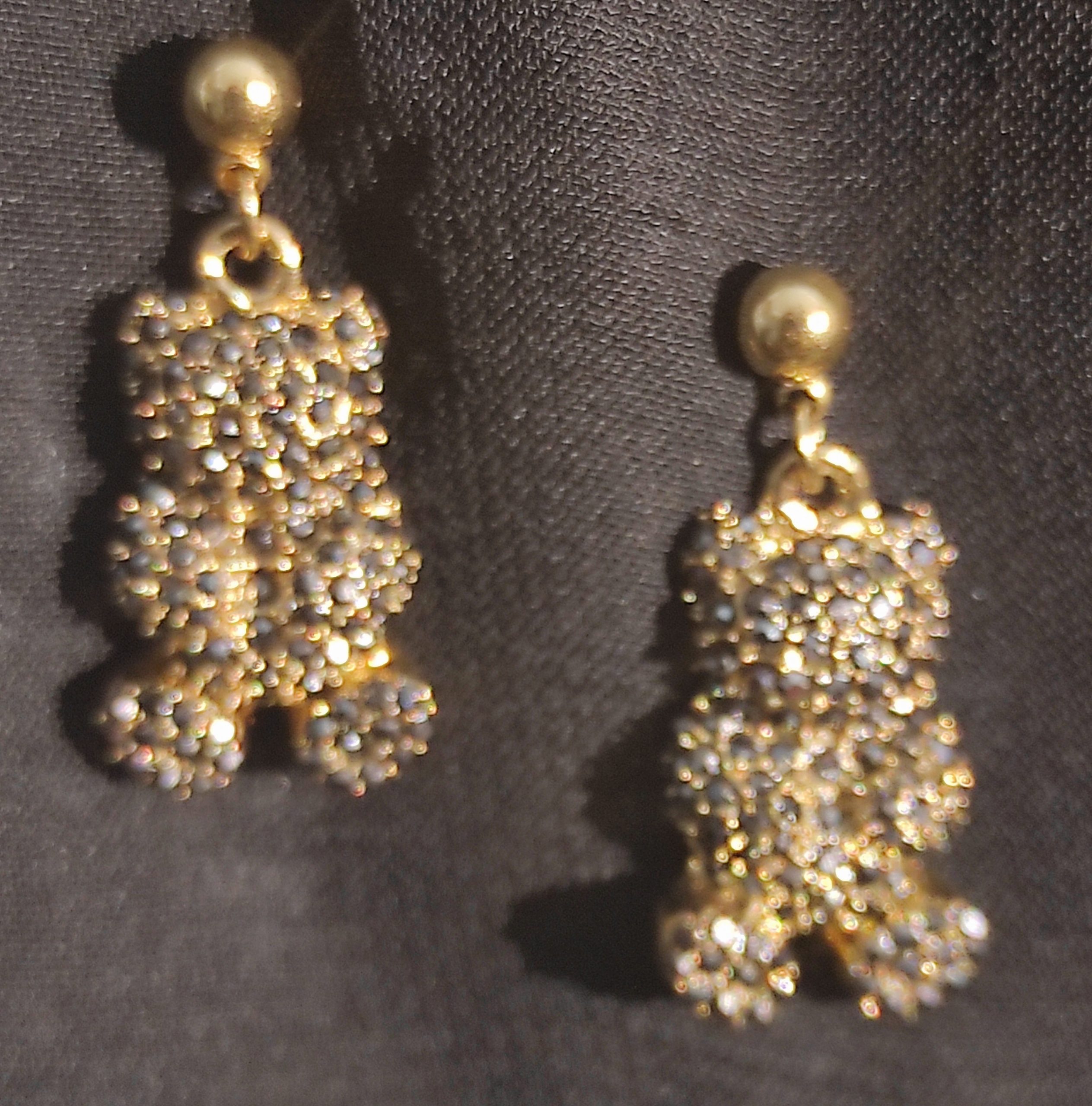 Tres mignonnes paires de boucles d’oreilles, ces petits oursons sont montes sur acier inoxydable, plaque or,  serties de jolis cristaux gris tres brillants. Travail fin et de qualite. environ 3cm de hauteur.